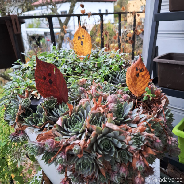 Eine große Anleitung kann ich euch für diese super einfacher und schnelle Bastelei und Dekoration nicht liefern. Einfach rausgehen, ein paar Blätter vom Boden aufheben und mit einem schwarzen Filzstift die Gespenstergesichter aufzeichnen.