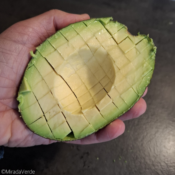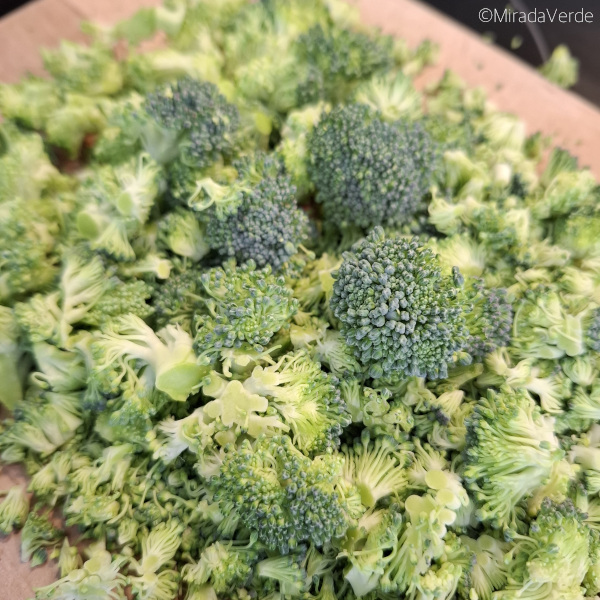 - Die äußerste Schicht des Brokkolis mit einem großen schwarzen Messer abschneiden, sodass man nur die zarten Teile im Salat hat. In Summe hat dies bei mir 80 g ergeben. (Der Rest lässt sich gut in der nächsten Suppe verarbeiten.)