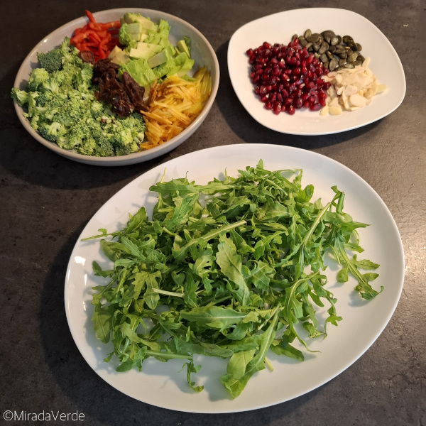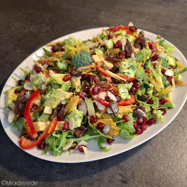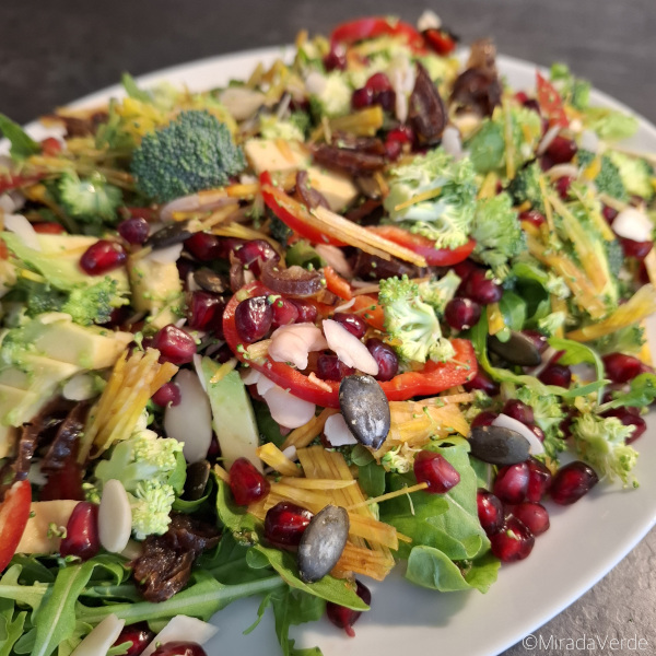 Ja, der Schnee liegt draußen und mehrheitlich dominieren zu dieser kalten Jahreszeit Suppen die Küche. Doch manchmal hab ich trotzdem Lust auf Salat. Deshalb gibt es auch für euch heute welchen. Brokkolisalat mit Huhn um genau zu sein. Ein bunter Mix aus Gemüse geprägt von frischer Avocado, knackigen Granatapfelkernen, feinen Mandelplättchen, erdiger Goldrübe, nussigem Ruccola und süßer Dattel.