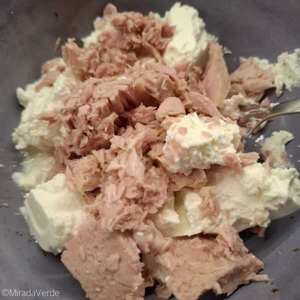 Während dieser Zeit 125 g Magertopfen mit 75 g Thunfisch naturell aus der Dose vermischen.