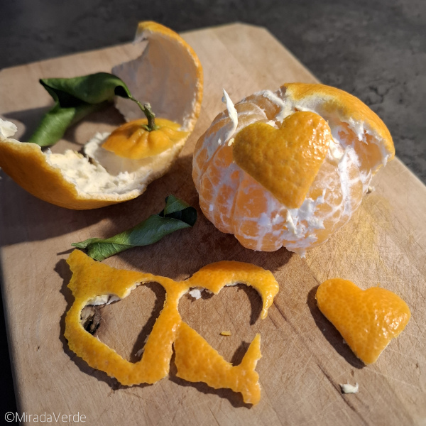 - Eine Mandarine oder Clementine schälen, dabei drauf achten, dass man möglichst großflächig abschält.