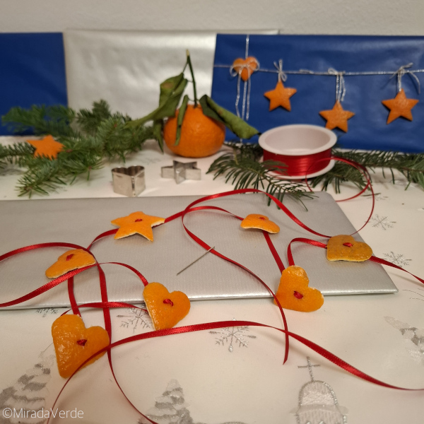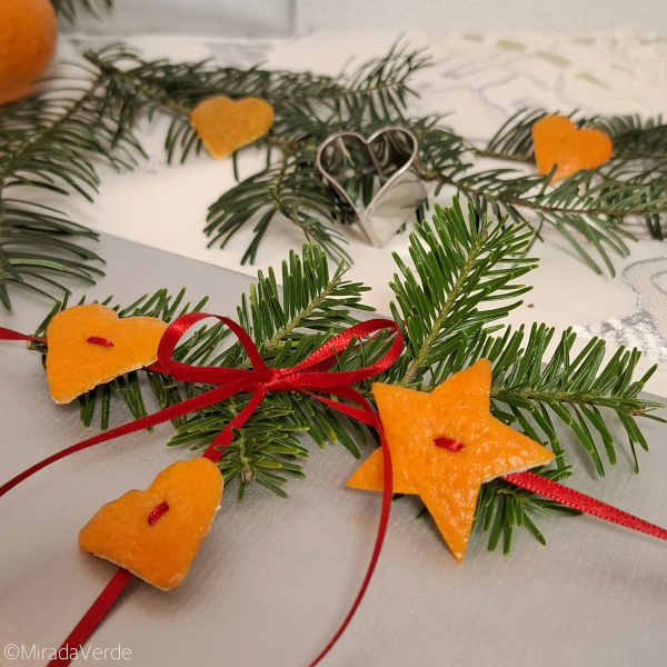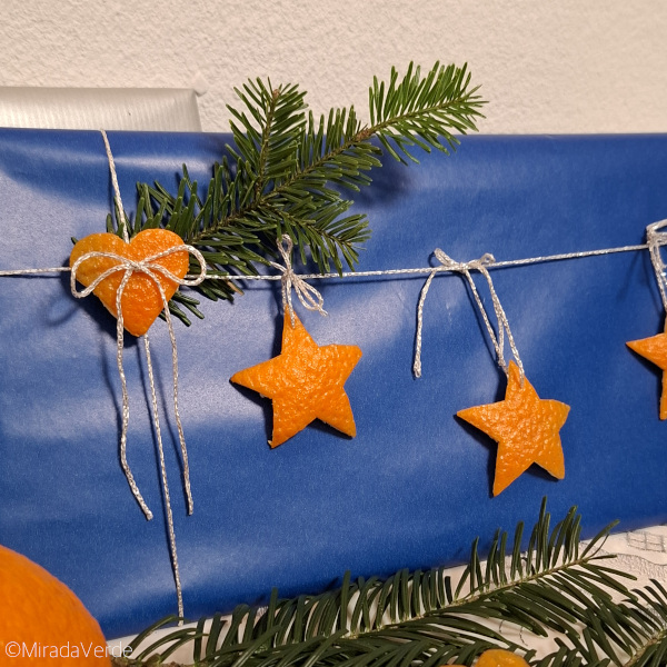 - Die Clementinenschalenherzen und -sterne auf einen dünnen Faden oder ein sehr dünnes Geschenkeband auffädeln oder vielmehr aufnähen und das Weihnachtsgeschenk so dekorieren.