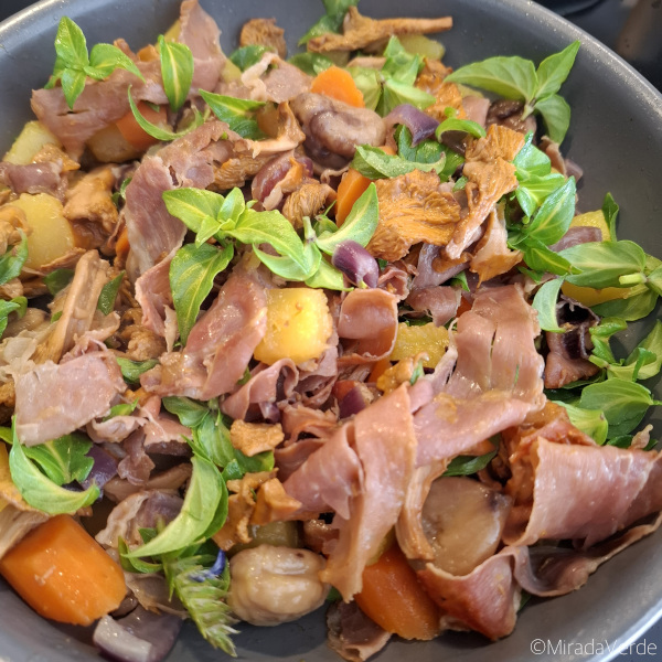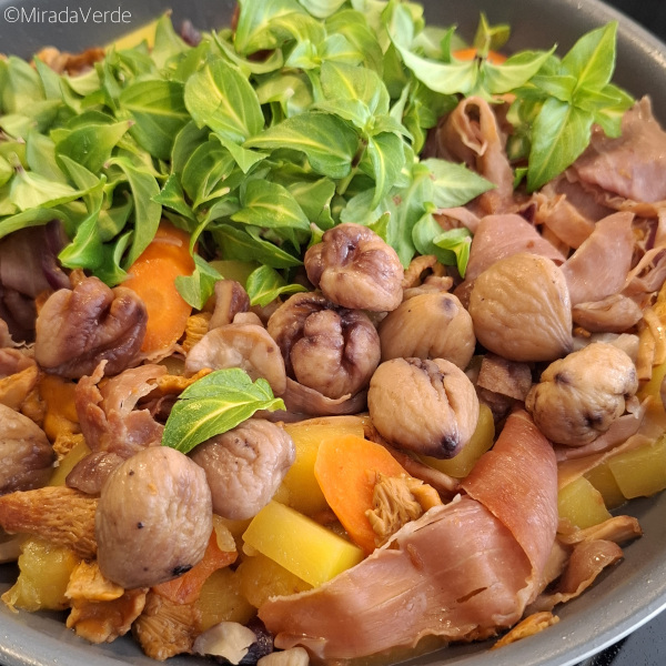- Gemeinsam mit 100 g gegarten Maroni zum Gröstl geben und auf der abgeschalteten Herdplatte durchziehen lassen bzw. durchwärmen.