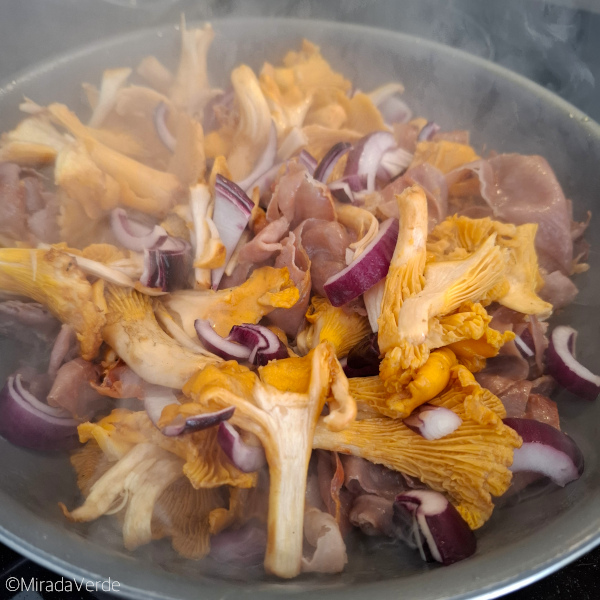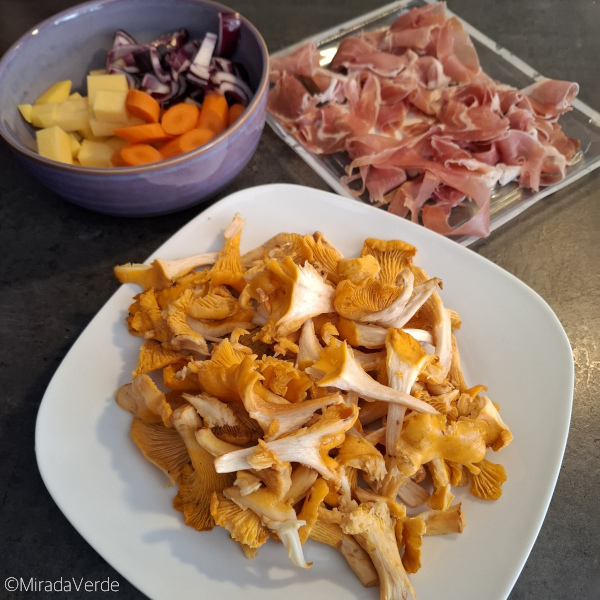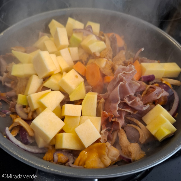 - Den Rohschinken scharf anbraten, die Zwiebel und Eierschwammerl zugeben und unter wenden weiterbraten. Ein bisschen salzen, damit sie Wasser lassen (nicht zu viel, denn der Speck ist eigentlich salzig genug!). Die Hitze etwas zurücknehmen, den vorbereiteten Kürbis bzw. die Karotte zugeben und auf kleiner Flamme bissfest garen.
