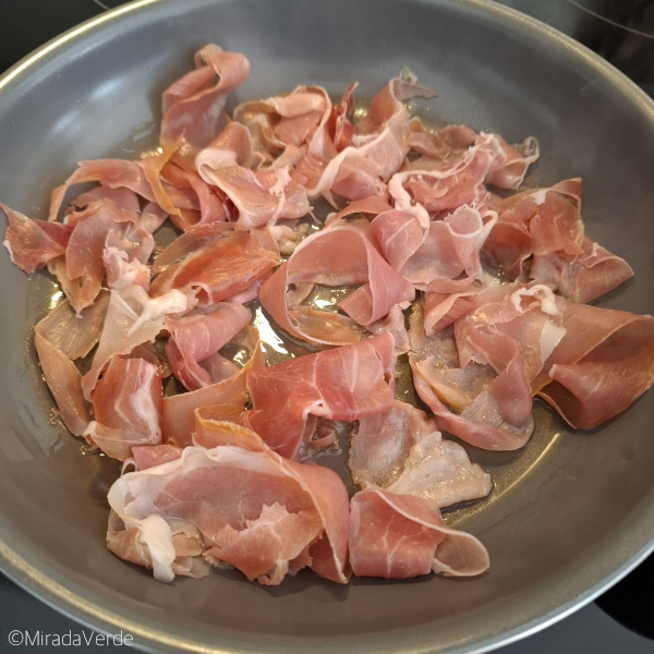- 100 g Rohschinken ebenfalls mit den Fingern in Stücke reißen, alternativ mit dem Messer in Streifen schneiden. Genauso gut könnt ihr natürlich Speckwürfel verwenden.