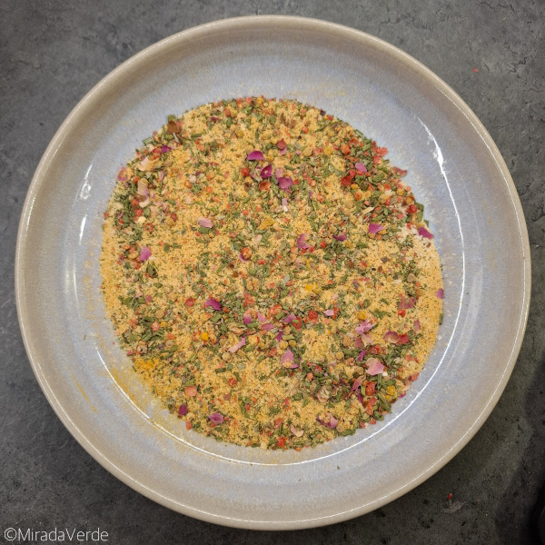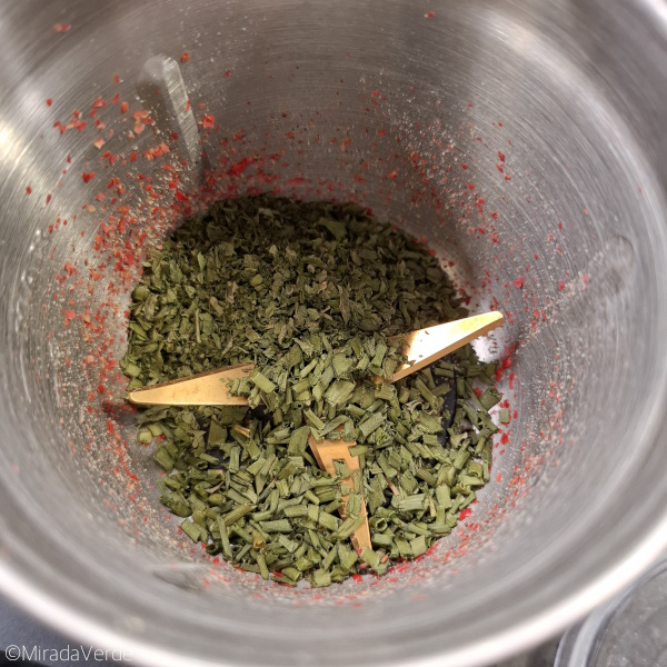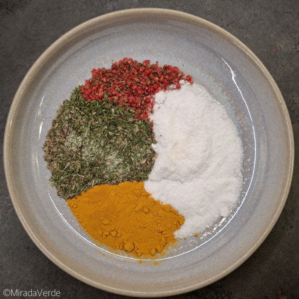 - 1 TL Schnittlauch, 1 TL Petersilie und 1/2 TL Basilikum zusammen mahlen und zur Mischung geben. Ebenso 1 EL gemahlenen Kurkuma.
