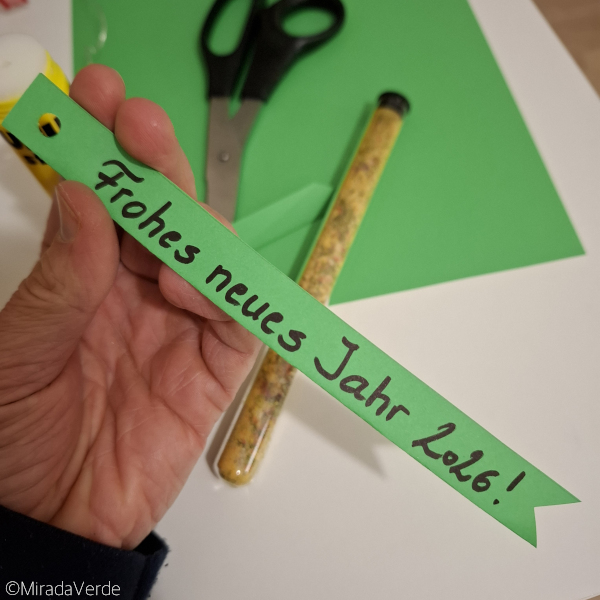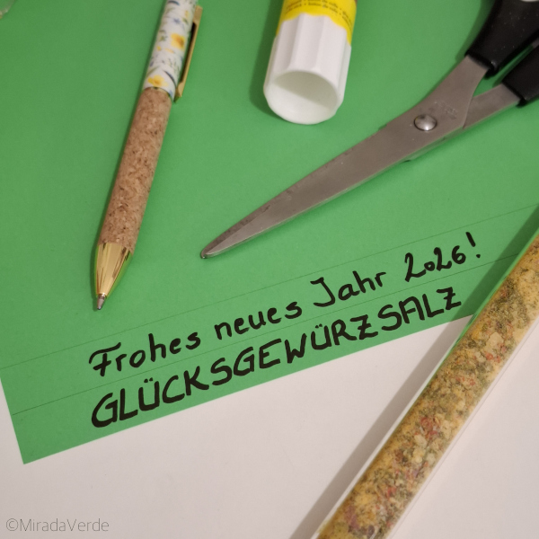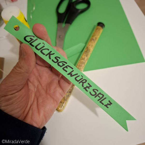 - Auf einen 3 cm breiten grünen Papierstreifen “Glücksgewürzsalz” und “Gutes neues Jahr 2026” oder andere Neujahrswünsche eurer Wahl übereinander schreiben. Den Streifen der Länge nach falten, zusammenkleben, auf die richtige Länge schneiden und oben ein Loch mit dem Locher machen.