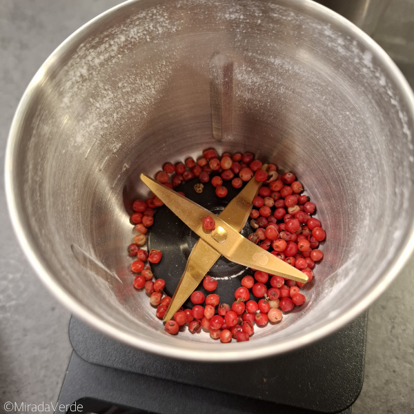 - 2 TL Rosa Pfefferkörner mahlen und zugeben.