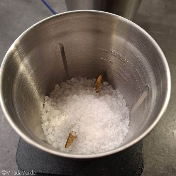 - 50 g grobes Meersalz fein mahlen und in eine Schüssel geben.