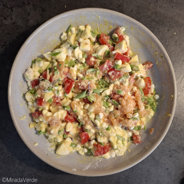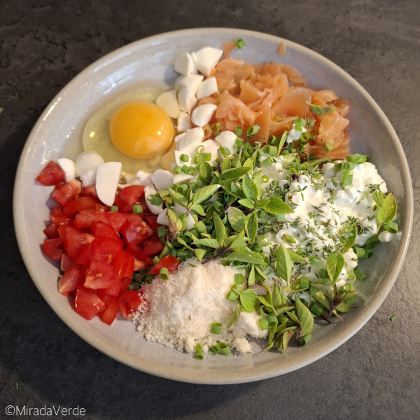 • Frische Kräuter hacken, gemeinsam mit 1 Ei, 100 g Cottage Cheese, 50 g Räucherlachs in kleine Stücke geschnitten, 30 g Mozzarella geschnitten, 20 g Parmesan und 50 g Tomaten kleingeschnitten mit einer Gabel in einer Schüssel oder einem tiefen Teller miteinander verrühren.