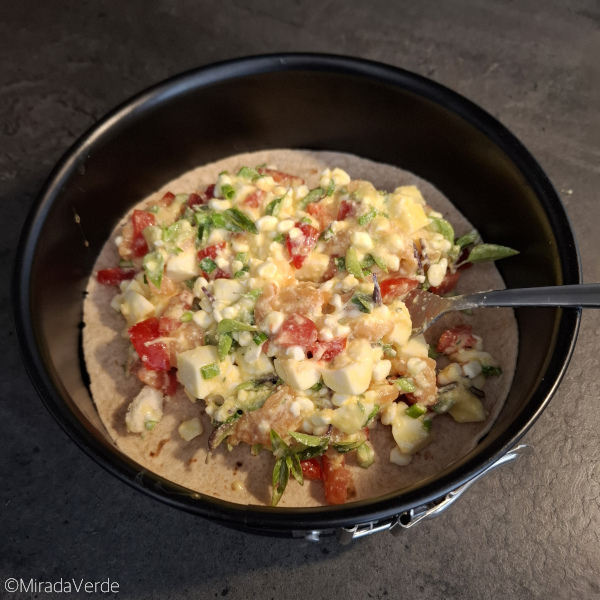 • Eine kleine Springform mit einem Wrap auslegen. Idealerweise steht der Wrap ein ganz klein wenig an der Wand hoch.