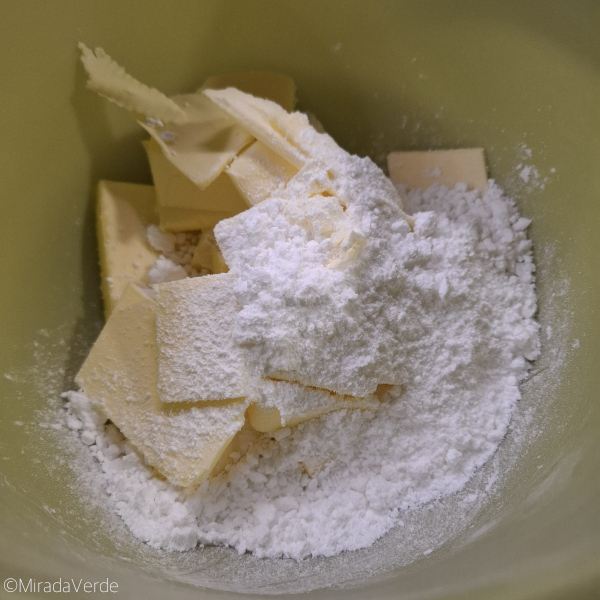 - 225 g Butter in Stücke schneiden und gemeinsam mit 100 g Staubzucker mit dem Mixer schaumig schlagen.