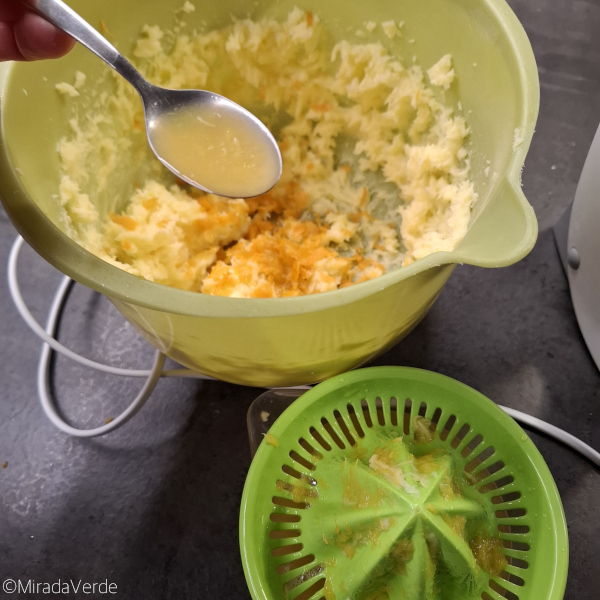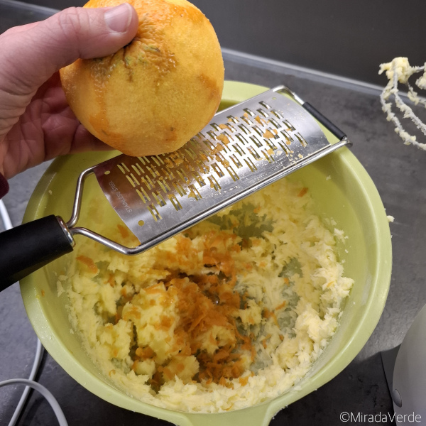 - 1 TL Vanilleextrakt, die Zesten einer Orange (Schale zum Verzehr geeignet) sowie 1 EL Saft dieser Orange untermixen.