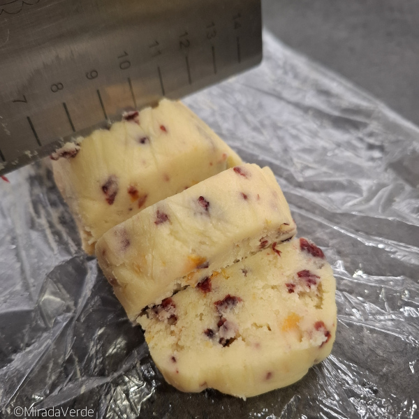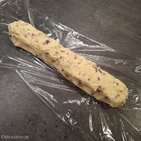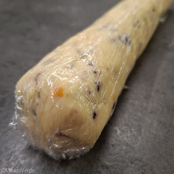 - Den Teig auf Stück Frischhaltefolie geben, zu einer 32 cm langen Rolle geformt in diese einwickeln und etwa 1 Stunde rasten lassen.