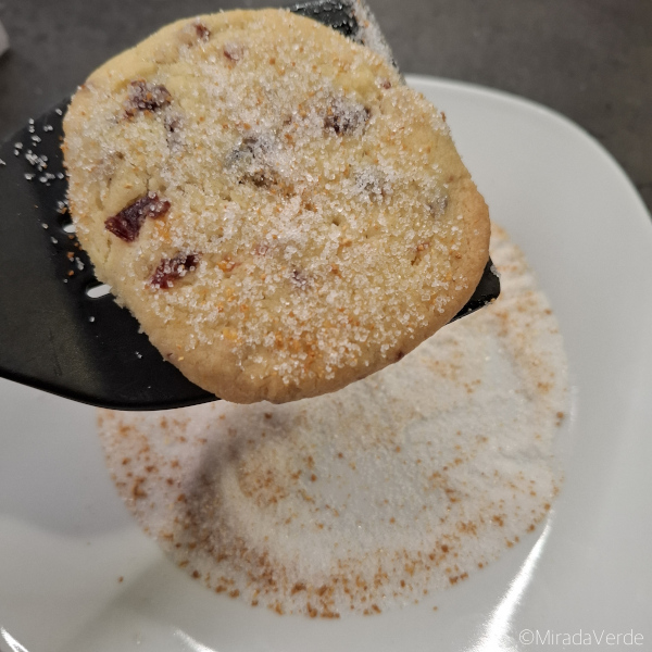 - Wenn der Rand leicht gebräunt ist, aus dem Rohr nehmen und noch heiß mit der Oberseite in die Orangenzuckermischung legen. Heiß deshalb, damit der Zucker anhaftet. Im heißen Zustand sind die Kekse aber gleichzeitig noch sehr zerbrechlich! Zügiges, dennoch sehr behutsames Arbeiten ist geboten.