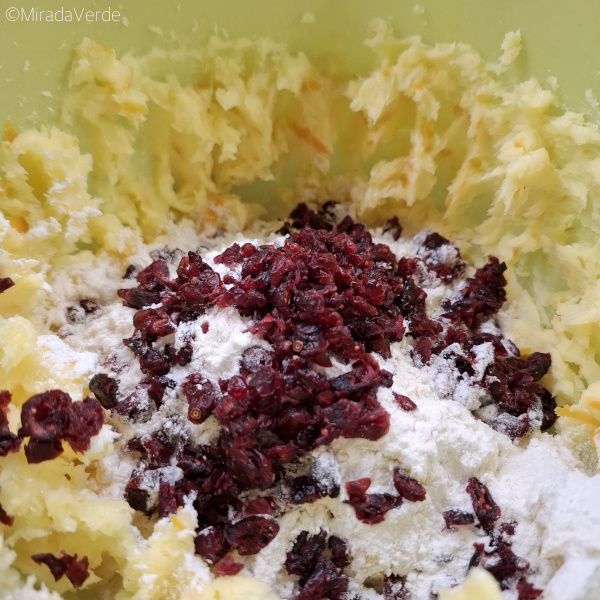- 250 g Weizenmehl Typ 480 oder 700, 60 g getrocknete, gehackte Cranberries und eine Prise Salz zugeben und ebenfalls einmixen.
