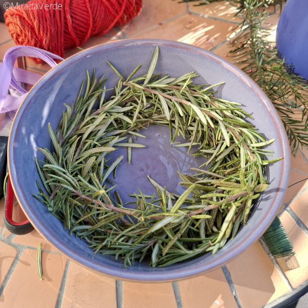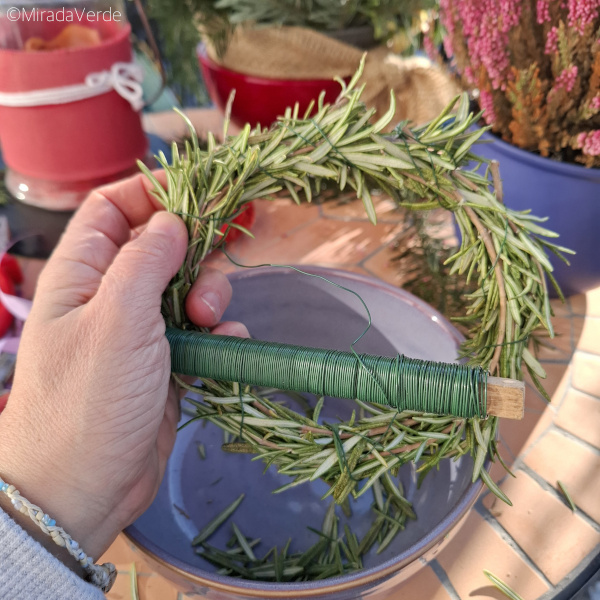 - Dan fixiert ihr an beliebiger Stelle einen Bindedraht von der Spule am Kranz und wickelt ihn nach und nach locker um die im Kreis gelegten Rosmarinzweige. Beim Binden nicht vergessen eurem Rosmarinkränzchen euren Wunsch anzuvertrauen!