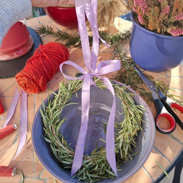 - Das Rosmarinkränzchen passt so gut wie überall als Dekoelement hin. Neben der Tür oder am Fenster aufgehängt finde ich es besonders passend.
