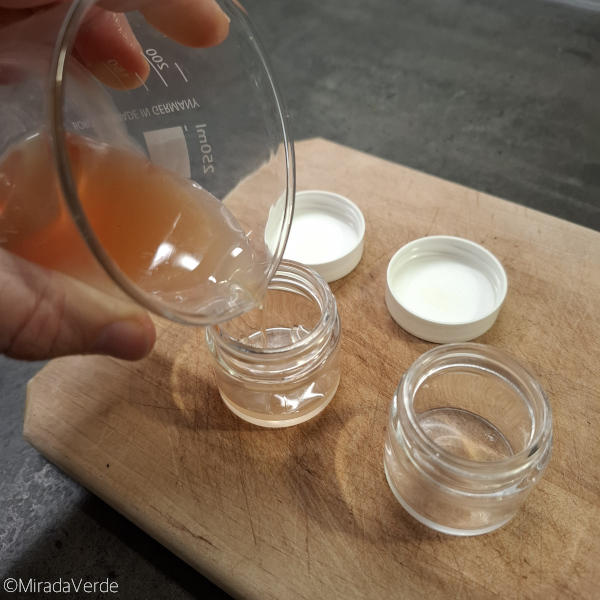 - Die flüssige Masse in kleine Tiegel gießen und vollständig erkalten bzw. aushärten lassen.