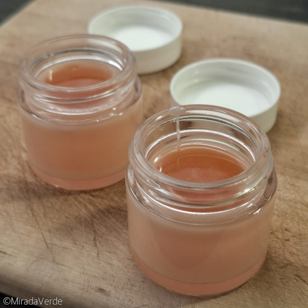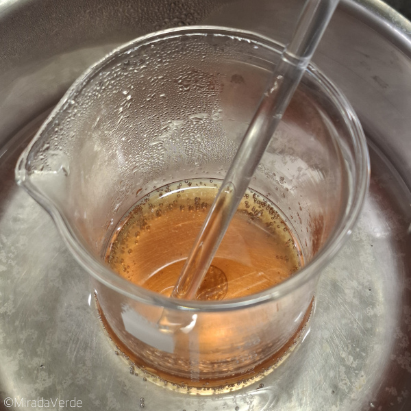 - 15 g Ringelblumenöl, 15 g Johanniskrautöl gemeinsam mit 4 g Bienenwachs, 4 g fester Kakaobutter, 4 g Carnaubawachs und 4 g Sheabutter in einem feuerfesten Rührglas im Wasserbad erhitzen und alles unter ständigem Rühren schmelzen. Carnaubawachs hat einen sehr hohen Schmelzpunkt (bei knapp über 80°C), es kann also eine Zeit lang dauern.