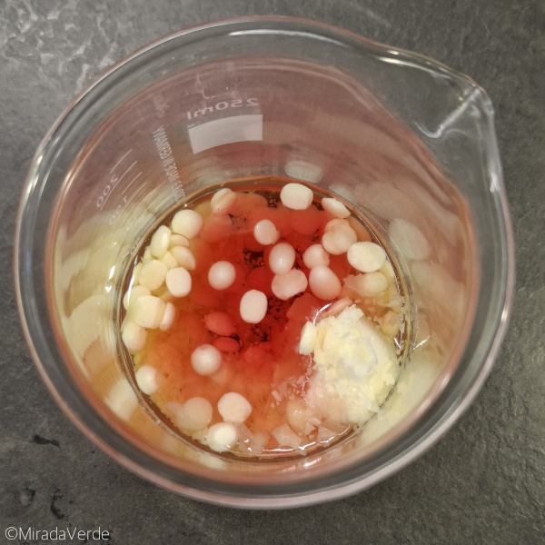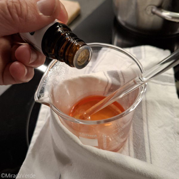 - Kurz bevor es wieder fest wird, 5 Tropfen ätherisches Lavendelöl und 5 Tropfen ätherisches Rosenöl einrühren.