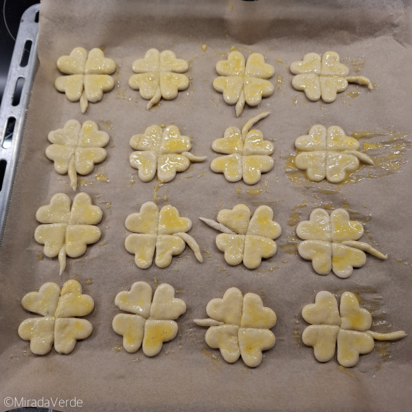 • Alles mit Ei bestreichen, damit die Kleeblätter schön glänzen und außerdem hilft auch das Ei, dass die Herzen zusammenkleben.