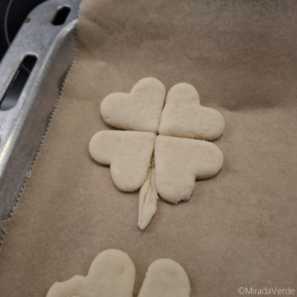 • Jeweils vier Herzen zu einem Kleeblatt zusammenlegen. Achtet darauf, dass sie vor allem in der Mitte gut zusammenstehen, denn beim Backen sollen sie zu einem Kleeblatt zusammenwachsen.