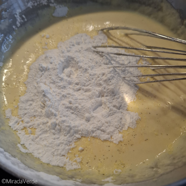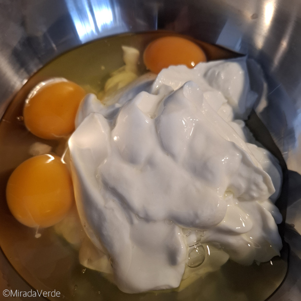 - 500 g Skyr, 3 Eier, 1 Packung Vanillepudding und 50 g Staubzucker mit einem Schneebesen in einer Schüssel vermischen.