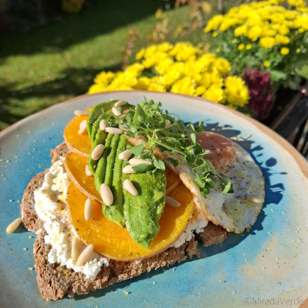 Aus der Idee ein simples getoastetes Schwarzbrot mit Topfen und geröstetem Kürbis zu versehen, ist während des Zubereiten zu einer vollständigen Hauptspeise erwachsen. Plötzlich war