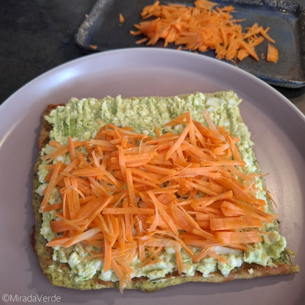 - Je 1/4 mit der Oberseite nach unten auf ein Teller legen, die Avocadofülle und die geriebenen Karotten darauf verteilen und zusammenrollen.