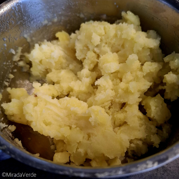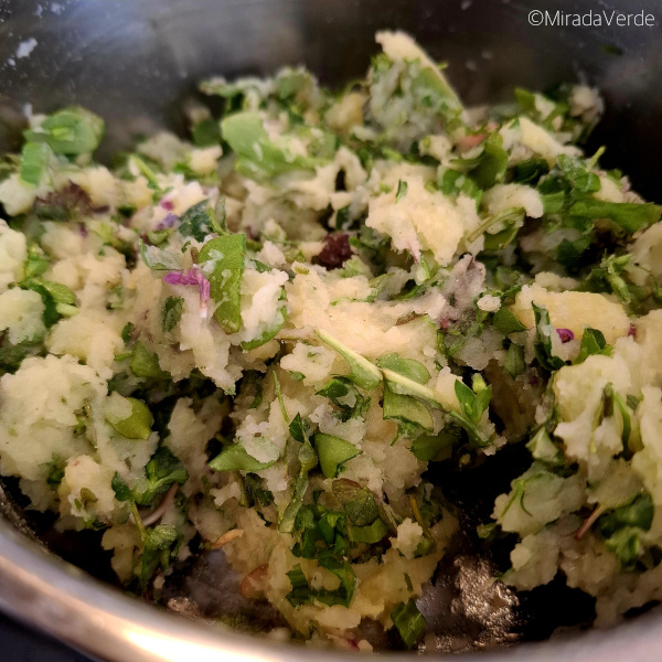 - Wenn die Kartoffeln gar sind das Wasser abgießen und sie mit einer Gabel zerdrücken. Die Wildkräuter zugeben. Ich hatte ca. das 1 – 1,5 fache Volumen an gehackten Wildkräutern zur gestampften Kartoffelmasse. Mit Salz und Pfeffer abschmecken und als Beilage servieren.