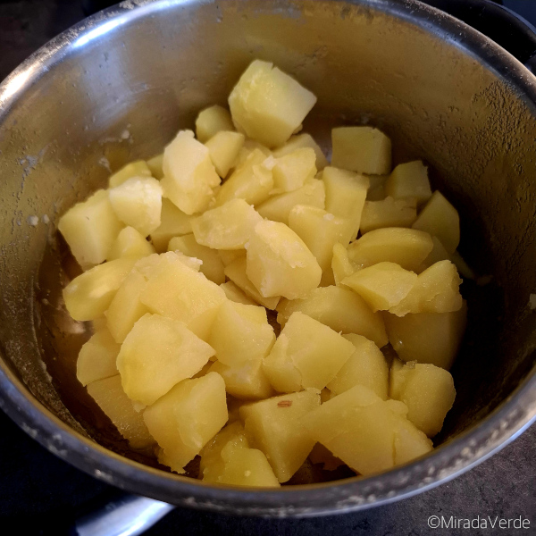 - Mehlige Kartoffeln schälen, in Stücke schneiden und kochen. Ihr könnt sie natürlich auch im ganzen in der Schale kochen oder dämpfen. In Stücke geschnitten geht es nur um ein Vielfaches schneller und macht für den Stampf ohnehin keinen Unterschied.