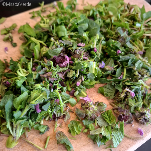 - Währenddessen Wildkräuter (Brennnessel, Giersch, Gundelrebe, Taubnessel, Vogelmiere, Spitzwegerich, Löwenzahn, behaartes Schaumkraut, Sauerampfer, Gänseblümchen, Bärlauch, Schafgarbe, Schabockskraut, Dost etc.) sammeln und hacken.