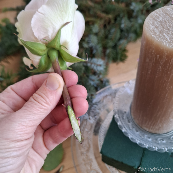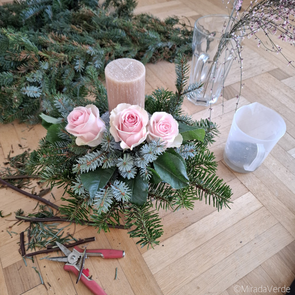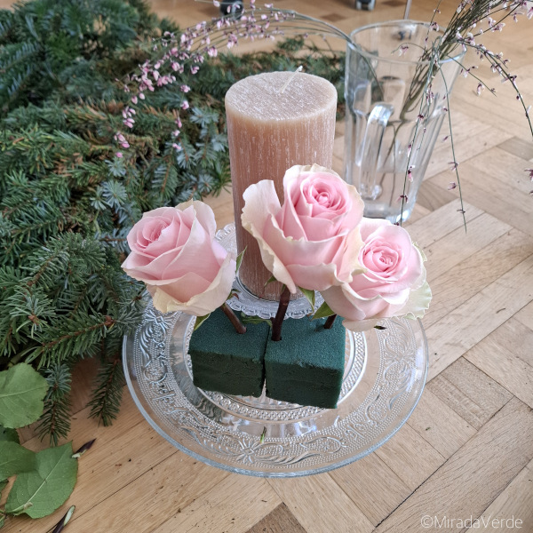 - Die Kerze in die Mitte setzen, dann die Rosen so arrangieren, dass sie einen gefallen.