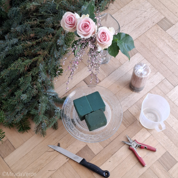 - Einen mit Wasser getränkten Nasssteckschwamm auf ein Teller setzen. Darauf ein kleineres Teller stellen worauf die Zirbenkerze Platz hat, ohne dass sie nasse Füße bekommt.