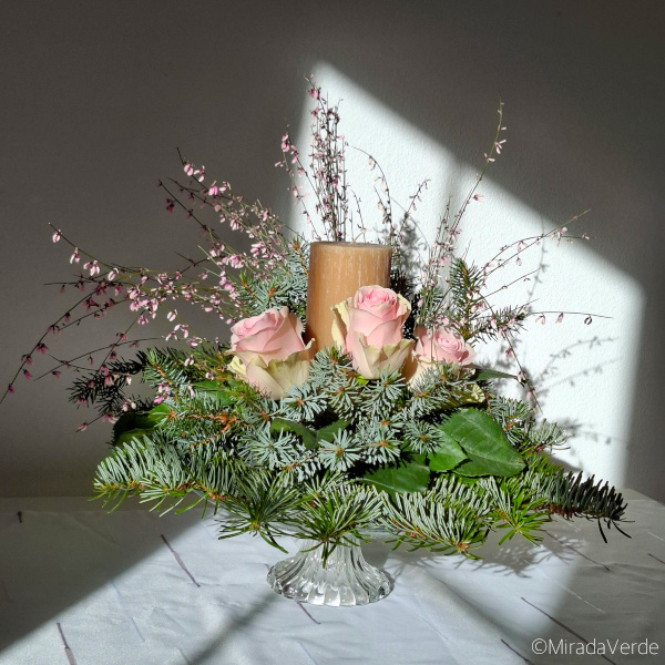 Die unglaublich gut duftende Zirbenkerze, die ich vor ein paar Wochen am Christkindlmarkt gekauft habe, sollte einen ganz besonderen Platz bekommen! Der Mittelpunkt eines schönen Gestecks erschien mit hier gerade passend. Zum Winter und Waldduft passend habe ich zwei verschiedene Tannensorten gewählt. Ich wollte es aber zu Neujahr ebenso elegant und duftig leicht haben. Deshalb habe ich mir noch zartrosa Rosen in der Gärtnerei besorgt. Dass mir dabei auch noch luftig, leichter Ginster in die Hände fiel, war eine glückliche Fügung. In Summe ist das Zirbenkerzengesteck eine super schöne Tischdekoration, die winterliche Bodenständigkeit und frühlingshafter Leichtigkeit vereint.